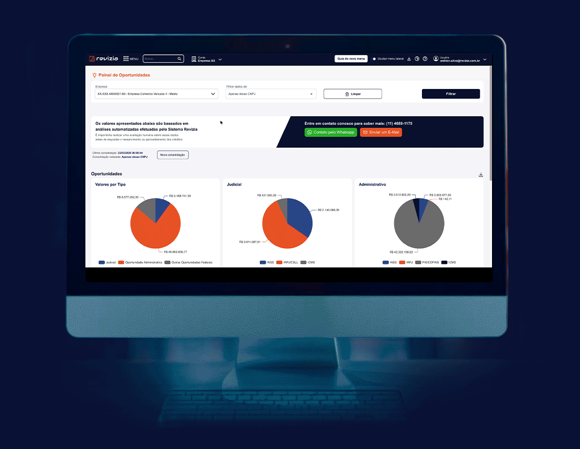 O acesso à visualização das oportunidades de recuperação tributária e o monitoramento 24/7 estão inclusos na assinatura mensal do módulo. Se você optar por realizar a recuperação dos valores utilizando a equipe de especialistas da Revizia ou parceiros homologados, será cobrada uma taxa de êxito (success fee) apenas sobre o valor que efetivamente voltar para o seu caixa.